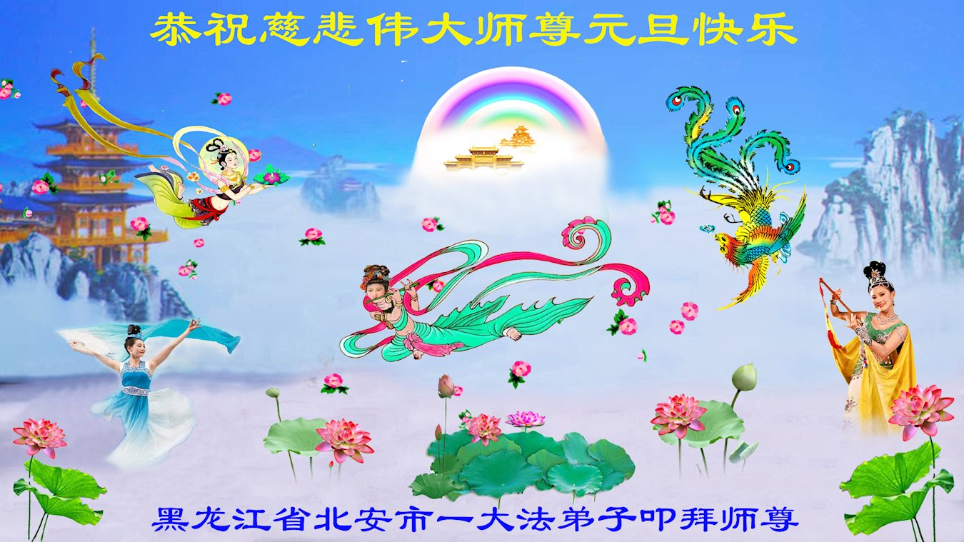 恭祝慈悲伟大师尊元旦快乐! 您为救度洪穹苍宇芸芸众生,遭受了难以想象的罪,您为我们操尽了心,弟子决不辜负师尊的慈悲苦度,多学好法,多救人,一定珍惜这万古机缘。 黑龙江省黑河市北安市一大法弟子叩拜师尊 黑龙江省鹤岗市萝北县宝泉岭农场全体大法弟子恭祝慈悲伟大的师尊元旦快乐!