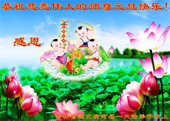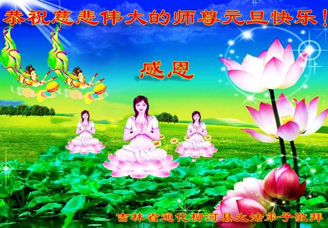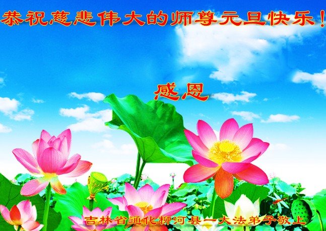 感恩师尊把我从迷茫中救起并引领我走上了回归之路,使我得到了宇宙大法,抓住了上天的阶梯。感恩师尊一路的保护。千言万语也表达不了对师尊的感恩!我决心在新的一年,多学法,走正师父安排的路,跟上正法進程。 吉林省通化柳河县大法弟子恭祝慈悲伟大的师尊元旦快乐!
