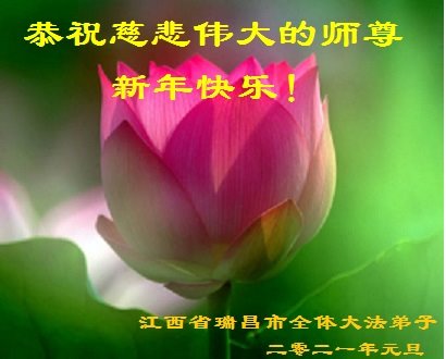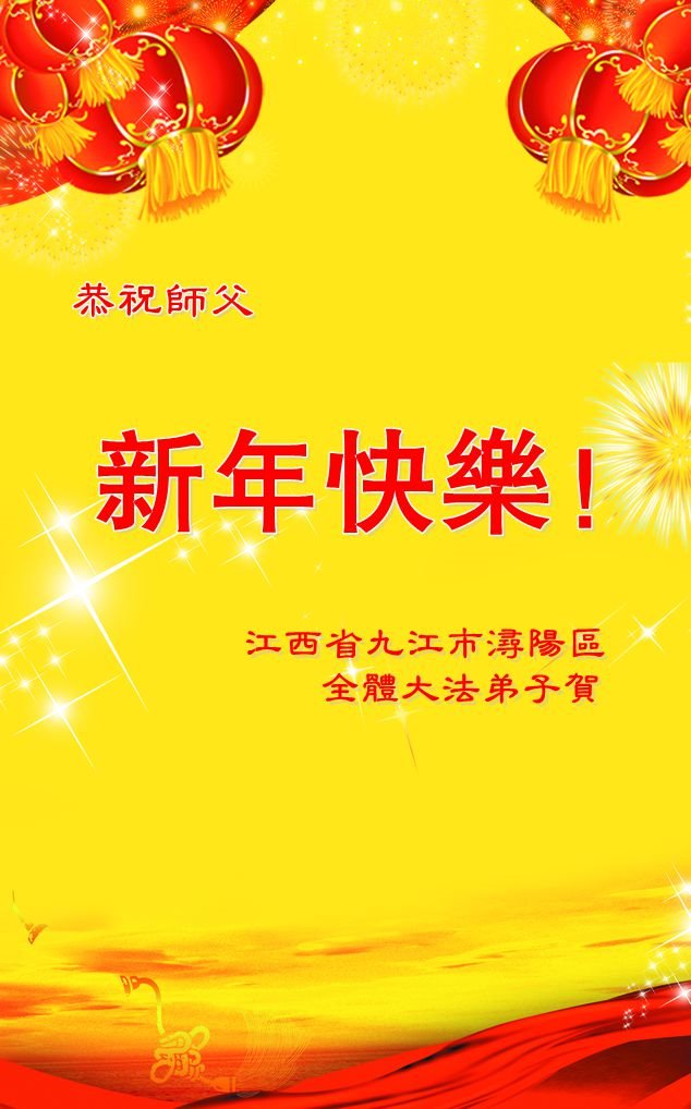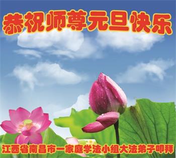值此新年到来之际,谨代表全家四个大法弟子及家人向慈悲伟大的师尊叩首合十问候!感谢师尊的救度之恩!在新的一年里,我们谨记师尊的教诲,学好法,向内找,救度更多的众生,圆满随师还! 江西省南昌市青云谱区一大法弟子恭祝慈悲的师父元旦快乐!