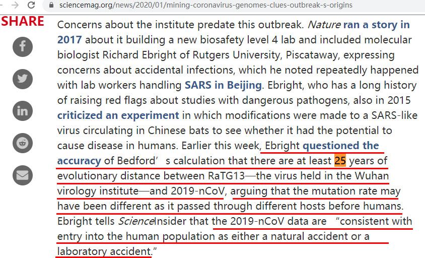 1、辩护强点进化论,一箭双雕可当真? 《专家一致认为新冠病毒非人造》这篇官面文章中,其中一条最有力的、有数据计算的“证明”,是美国华盛顿大学副教授贝德福德说的:“RaTG13(蝙蝠携带的自然病毒)和新冠病毒,这两种病毒的基因差异,与自然进化一致”,“两者在25~65年前有一个共同的祖先。因此,RaTG13突变为新冠病毒可能需要几十年。” 通俗地说就是:2011年开始从昆明山洞蝙蝠身上得到的冠状病毒RaTG13,和如今的新冠状病毒,是自然演化的关系,不是人工基因编辑的产物。 进一步,说前者进化到后者需要几十年,什么意思呢?它的重要含义是:假如真在2011年及以后,SARSr-RaTG13从武汉病毒所泄漏出去,也不可能进化成新冠病毒——时间不够!? 也就是说,利用进化论的辩护要起到一石二鸟的作用:新病毒既不是人工制造,又和病毒所是否泄漏无关,尽管它的祖辈在病毒所里,即使2011年后会偶然泄漏,也不可能进化成2019年的新冠病毒,因为时间不够。 这样以时间太短,暗示“泄漏说”不靠谱——那么,这个进化的证据靠谱么? 2、断章取义,掩盖质疑 追查上述分子进化论说法的出处[3],发现中共官媒的在断章取义、以偏概全,屏蔽了专家的反对意见。  图:美国科学周刊上Jon Cohen综述论文的截图1,25年的进化时间是以假定的突变速率计算。 |