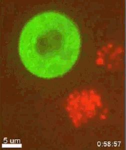 中共官媒只引用贝德福德的说法,回避了约.克翰(Jon Cohen)文章中指出的尖锐问题:进化论计算的时间25年有问题,因为病毒在不同宿主身上突变的速度是不同的,贝德福德以假定的恒定速度作为计算的基础[3]。因为基础错误,所以计算结果也不可靠。也就是说:上述进化论的说法,实际上无法排除实验室的泄漏可能性。 3、进化速度的辩护,实际上推翻了进化论 假设贝德福德假定的突变速度是对的,是不是他推算的25年进化时间就能成立?就能证明没有实验室泄漏呢? 同样不成立,因为推算的前提是错的。如果能这么推算的话,请推算一下,从单细胞生物进化到人的基因组,需要多少时间?这是进化论的死结所在,越高等生物基因组越稳定,病毒是最不稳定的。就算用最不稳定、变异最快的病毒突变速度来推算,从单细胞进化到人,宇宙的时间加N倍都不够。何止是人,我们眼见的任何一种生物,都不可能以基因突变的方式、从单细胞进化而来,宇宙的时间自乘都不够。 你能让大猩猩随机敲击键盘、幸运地制造出整个WindowsXP程序么?当然不能,那么从零进化到人就更不可能。我们眼睛能看到的任何一种动物,它的生长、发育、语言、思维、情感、适应、繁殖,超过了最复杂的计算机软硬件,它能是随机基因突变来的?无数个错误、病态、意外、巧合,堆砌出的进化幸运儿么? 进化论有太多的死结,那么,为什么太多学者视而不见,还当进化论是科学呢?因为进化论的基本逻辑是一个诡辩:因为不是神创,所以是进化;因为是进化,所以不是神创。 进化论发展到顶点,分子进化论的数学计算,反而证明了进化是不可能的——因为不是进化,所以是神创!进化论走到头,反而断了自己的归路,证实了神! 病毒是在演化、变异,而不是进化,科学育种的实践一再证明:高等生物物种之间的障碍不可逾越。 就病毒这种最简单的生命,它的综合复杂程度,也远远超过了人类的想象。以下图的艾滋病毒HIV为例。  图37:细胞被艾滋病毒感染后(荧光染色绿色),象长眼睛一样做出精准射击,射出病毒攻击人体细胞(作者提供) |