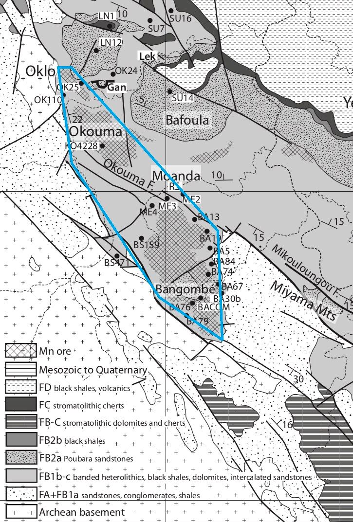 图4:Franceville沉积盆地西南部锰矿分布图(Jean-Yves Renaud et al., 2017) |