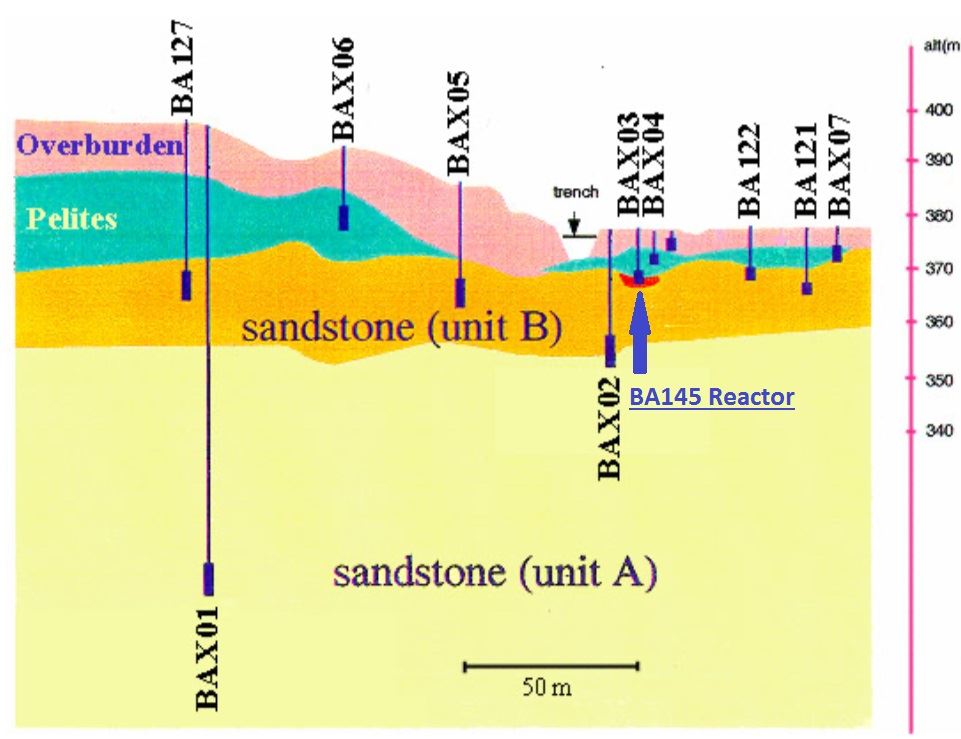 (4)从科学家绘制的沉积盆地西北至东南方向地层剖面和铀矿区示意图(图6)来看,这种联系就更明显了。已发现核反应堆的Oklo-Okelobondo矿区和Bangombe矿区恰好都在三角洲前缘亚相附近。 (5)按此推测,在Bangombe和Oklo之间沿与反应堆同一年代的三角洲前缘亚相地带,应该能找到更多的小反应堆。 当然找寻反应堆是不容易的。由于单个反应堆的尺寸不大,钻孔方位差一点都可能会错失机会。而且,反应堆所在区域未必一定伴随铀矿区,这就更增加了找寻的难度。图7就是这种难度的说明,在直线200米范围以寻找铀矿为目的的地下环境测量型勘探中,碰到核反应堆确实需要好运气。要寻找反应堆的话,此200米范围还需要从新勘探。 7. 围绕史前核反应堆的奇迹 所有的证据都指向唯一的可能:位于加蓬的远古核反应堆是史前文明的遗迹。 其实,《转法轮》中提到的多个史前文明遗迹都不难证实,甚至已有证据。 另外,围绕加蓬史前核反应堆还存在几个惊人的奇迹。 (1)反应堆在地下历经近20亿年仍保存完好 在地下越深,温度越高压力越大。如果地下环境温度超过200摄氏度,岩石就会发生变质(metamorphism),致使岩石的形态改变。研究发现,反应堆区域埋入地下10几亿年间最大温度为180-190/200摄氏度,恰好在岩石变质的温度边缘[5][9]。而FA地层底部已经由于高温开始发生变质[5]。只要埋藏再深一点儿,温度再高一点儿,反应堆区域就无法保持现在的面目了。 反应堆所在的Francevillian盆地沉积地层的变形之小和地层保存之好让许多研究人员啧啧称奇。 (2)铀235丰度测试 反应堆能被发现,源于Oklo露天铀矿在开采2年后,法国一家铀燃料处理厂内对铀原料的一次铀235丰度(铀235/铀238)测试。测试结果显示铀235丰度异常,从而掀起了逐步深入的调查,最终发现了核反应堆。这个测试发现其实是很偶然的,这是因为: • 此前科学界发现地球上甚至整个太阳系中的铀丰度都是固定的比率0.72%。完全没有必要去关注原料的铀235丰度。即使要测此值,在铀矿勘探时测量就行了。 • 铀矿进口两年都没关注过原料铀235丰度(后来才从之前开采的部份铀矿存留样品中也发现存在异常)。发现核反应堆后,科学界才号召各国把铀原料的铀235丰度列为常规测试[16]。 • 恰好测量的铀来自于含铀多体积大的1号、2号反应堆的局部和周边矿的混合料。即使这样,两个测试值(0.70%、0.71%)和标准值0.72%也并无大差异,测量人员没有把它们视作测量误差而忽视掉体现了强大的责任心。 这个测试发现是命运的再一次眷顾。  图7:Bangombe的BA145(BAX3)反应堆附近的钻孔剖面透视图 |