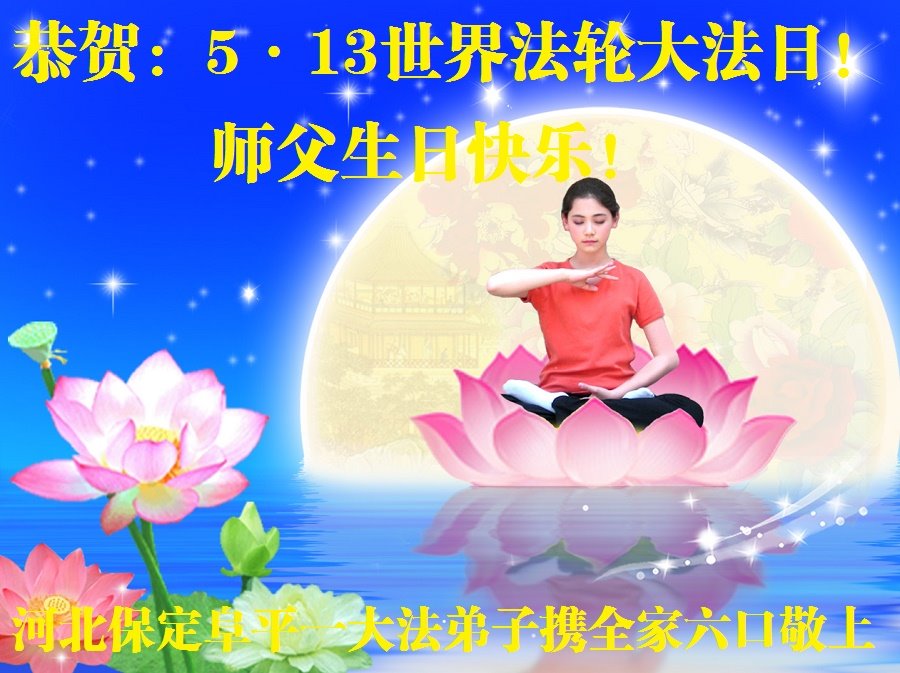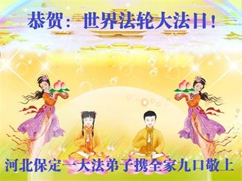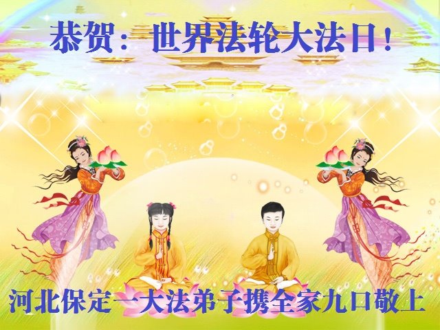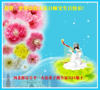 河北保定阜平一大法弟子携全家恭贺世界法轮大法日!恭祝师父生日快乐!