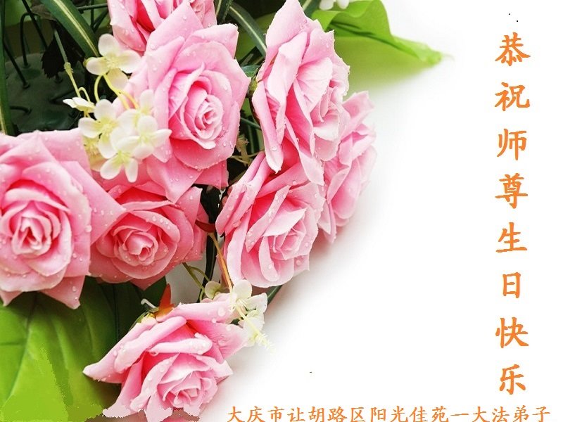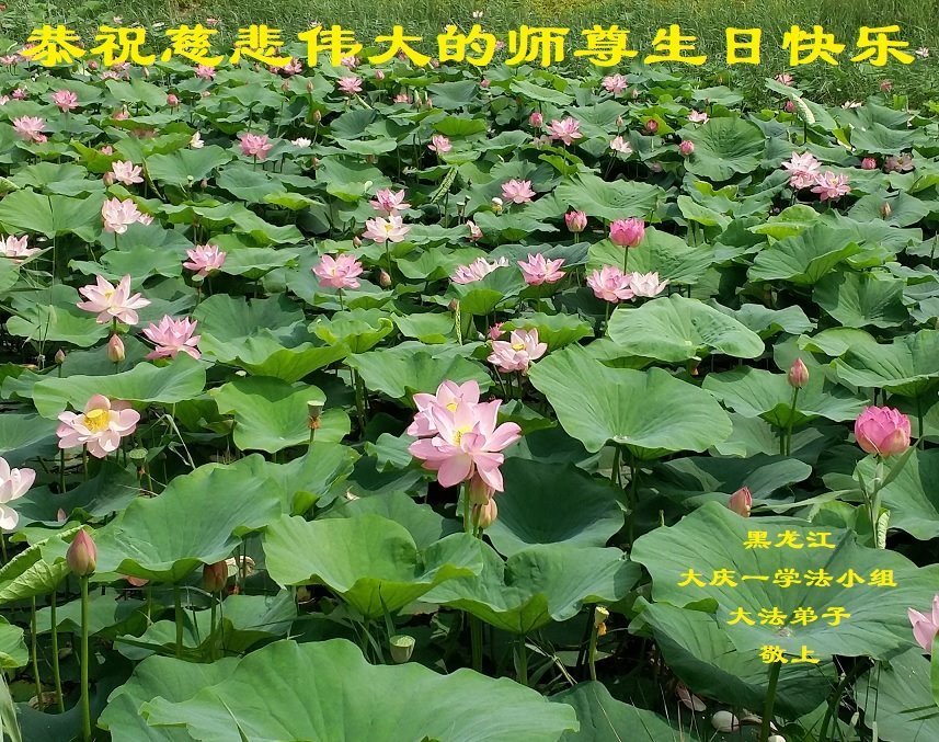 5.13世界法轮大法日快到了,我们感恩师尊的慈悲苦度。我们恭祝师尊生日快乐!师尊您辛苦了!千言万语也无法表达弟子对师尊的感恩。我们唯有修好自己,完成我们的责任、使命,多救人。 黑龙江省大庆市让胡路区西寨、阳光嘉城、明湖花园等全体大法弟子恭祝师尊生日快乐!