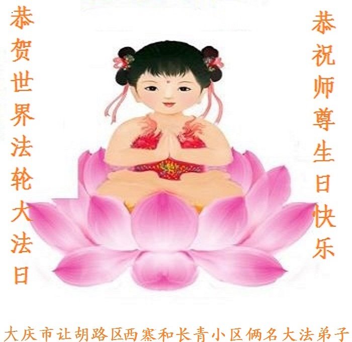 黑龙江省大庆市让胡路区阳光佳苑小区一名大法弟子恭祝师尊生日快乐!普天同庆法轮大法日!