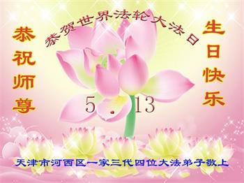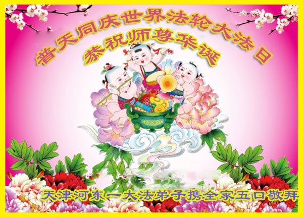 天津河东一大法弟子携全家五口恭祝师尊华诞!普天同庆世界法轮大法日!