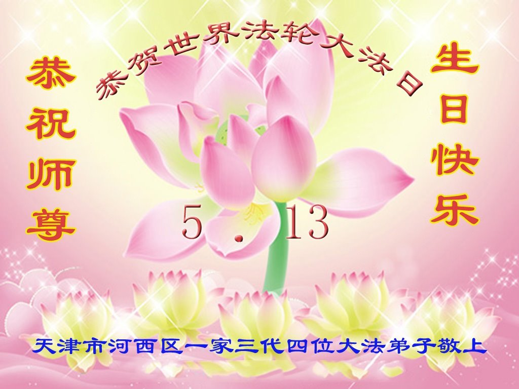 感谢师尊救度之恩,感恩师尊把宇宙大法洪传世间。弟子无法用语言感激师尊的慈悲救度,我们是最幸福的生命。弟子唯有学好法,修好自己,走好以后的路,做好三件事。让师尊少一份操劳,多一些欣慰,圆满随师还。 天津市北辰区大法弟子恭祝慈悲伟大的师尊生日快乐!庆祝世界法轮大法日!