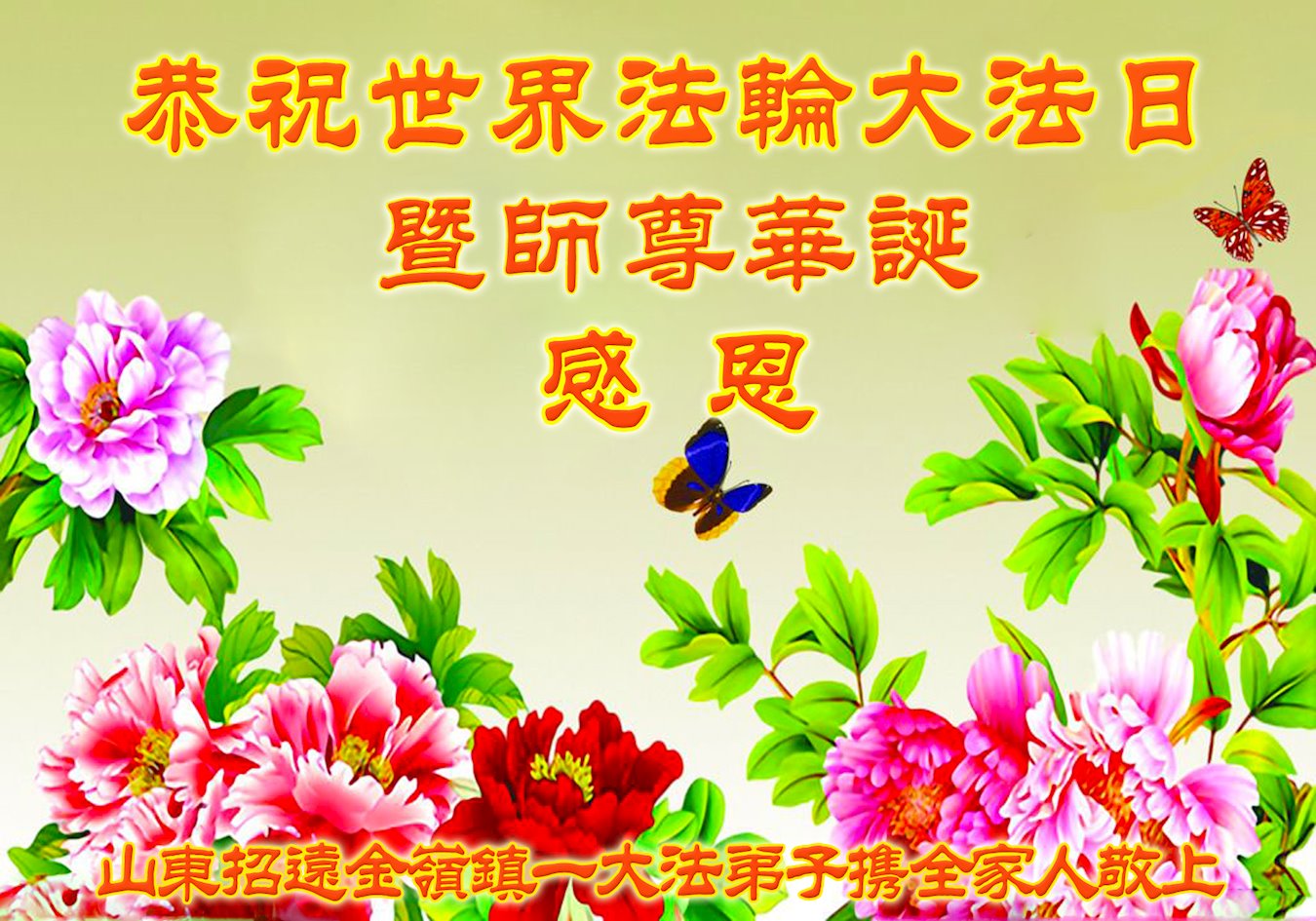 恭贺世界法轮大法日! 山东省烟台市招远市金岭镇一大法弟子携全家恭祝世界法轮大法日暨师尊华诞!