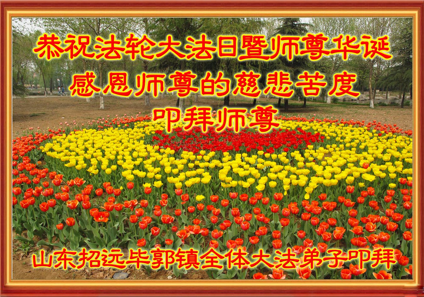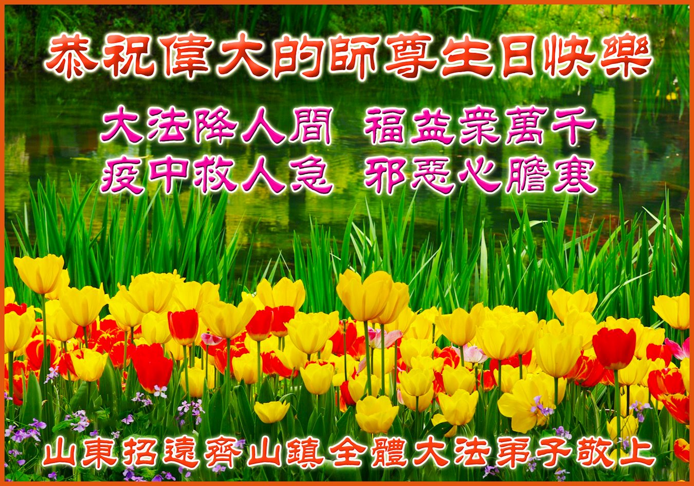 尊敬的师父您好! 您把这么好的大法传于人世间,您为救众生吃的苦,操的心,有谁能知道呢?就连我们得法的弟子也无从知道的,但是我们都知道法轮大法是真正能救人的最好最正的高德大法,师父是最伟大的觉者!我们全家人都相信大法,支持大法,相信师父,尊敬师父,一直到永远!我们会跟随师父走到最后。 谢谢慈悲伟大的师父!恭祝师父生日快乐! 山东省烟台市招远市齐山镇全体大法弟子恭祝师尊生日快乐!暨世界法轮大法日!