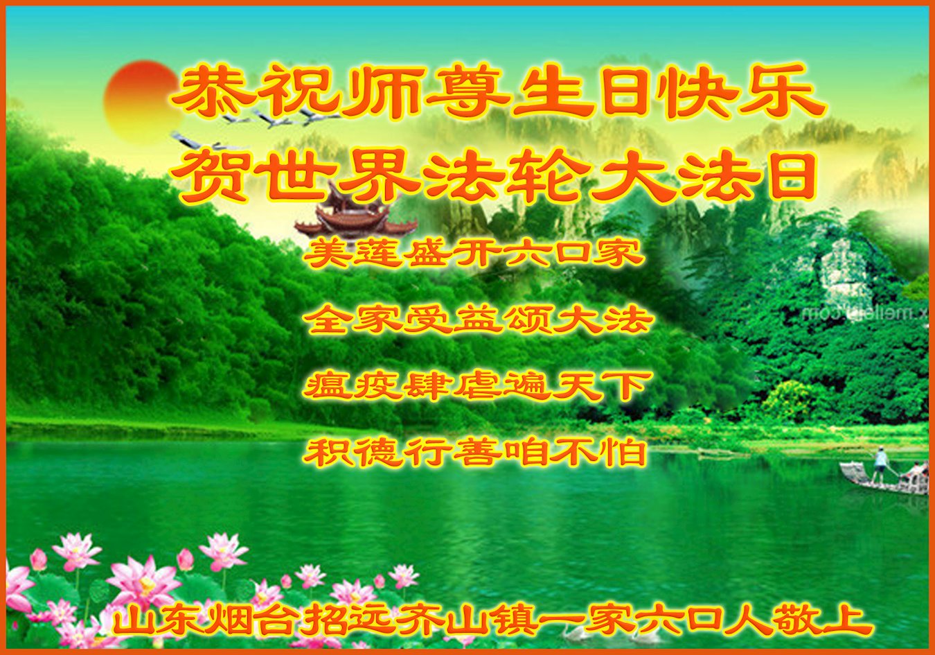 大法降人间 福益众万千 疫中救人急 邪恶心胆寒 山东省烟台市招远市齐山镇一家六口恭祝师尊生日快乐!暨世界法轮大法日!