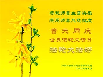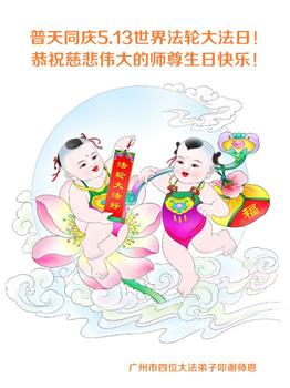 广东省广州市四位大法弟子恭贺世界法轮大法日!恭祝慈悲伟大的师尊生日快乐!