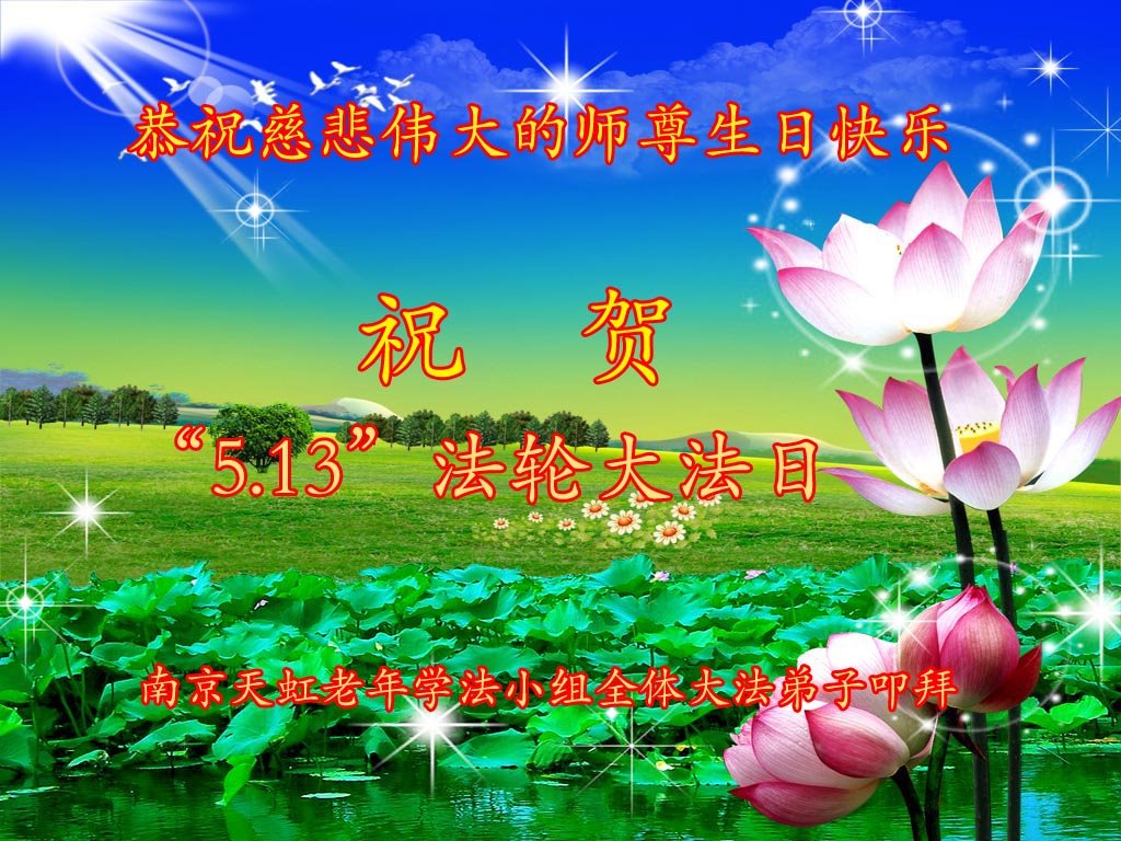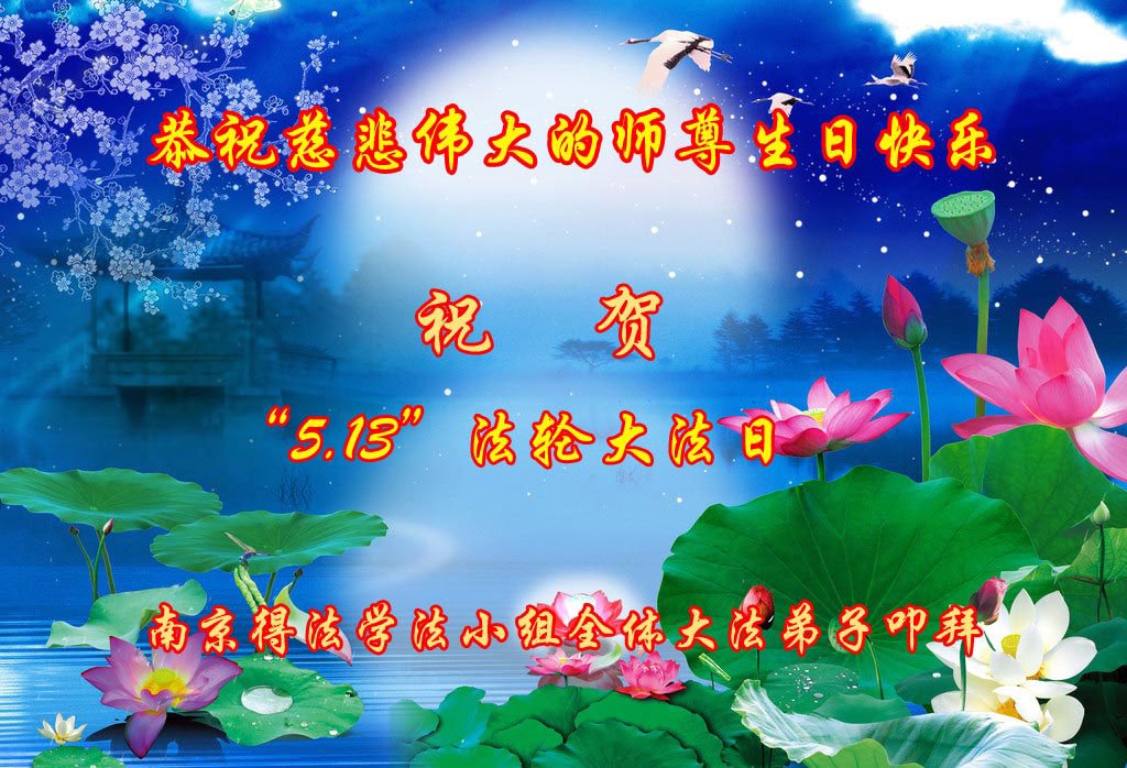 江苏省南京得法学法小组全体大法弟子恭祝慈悲伟大的师尊生日快乐!祝贺“5.13”法轮大法日!