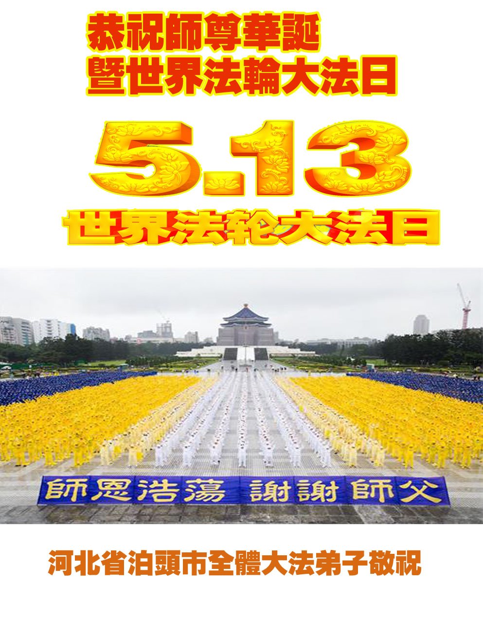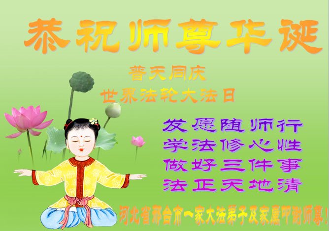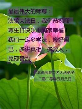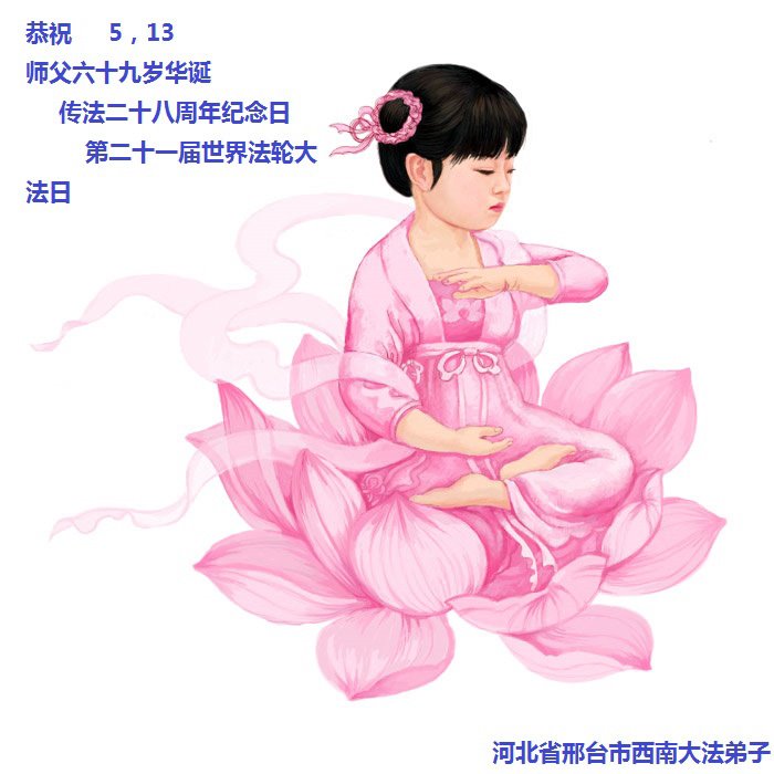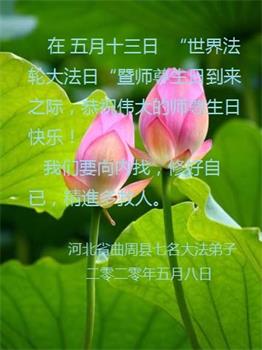 在5.13法轮大法日到来之际,感谢师尊慈悲救度!今后不论多么艰难,做好大法弟子应该做的事,不辜负师尊期望。 河北省大法弟子庆祝5.13世界法轮大法日!恭祝师父生日快乐!