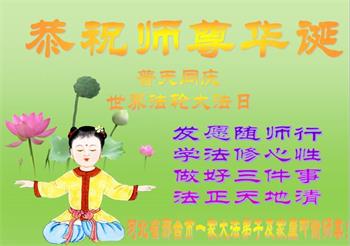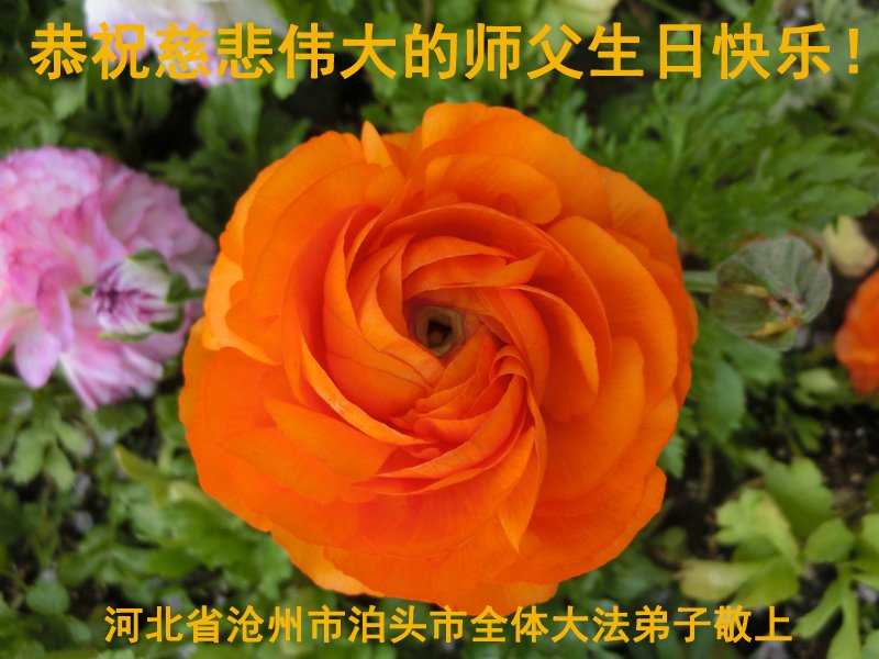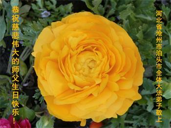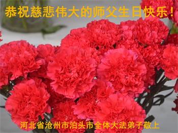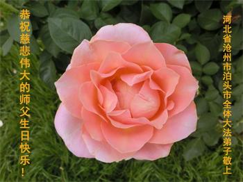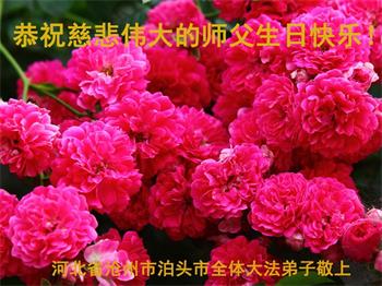 尊敬的师父:在这佳节到来之际,在这普天同庆、同祝、同颂的日子里,河北省沧州市泊头市大法弟子恭祝师尊生日快乐!在学法中,我们知道了大法法理的洪大无边!在实修中,我们知道了师父的慈悲苦度!在救人中,我们知道了师父的洪恩浩荡!在我们越来越知道了师父所给予我们的一切,我们越来越知道自己的责任和使命!我们无以言表,唯有感恩!千言万语说一声:师父,辛苦了!万语千言道一声:师父,谢谢您!我们会努力兑现自己的誓约!谢谢师父! 河北省衡水市深州市一学法小组大法弟子恭祝师尊生日快乐!谢谢师尊!师父辛苦了!