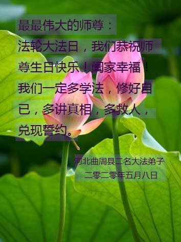 发愿随师行 学法修心性 做好三件事 法正天地清 泊头市大法弟子恭祝师尊华诞及世界法轮大法日!
