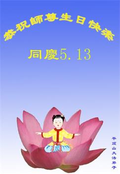 每当想到看到师父,弟子心中都会升起无限的敬仰,师尊为了救度整个宇宙众生吃了无数的苦,为众生承受那么多,有多少众生能够理解师尊那浩瀚的胸怀,无量的慈悲!对众生的慈悲保护!在弟子的修炼过程中,师父每时每刻都在看护着弟子,每次生命的危险都是师父的慈悲保护才化险为夷。弟子每次犯错误,师父总是鼓励弟子下次做好,给弟子改过的机会。没有师父的慈悲保护就没有弟子的现在和未来!无论在修炼中遇到多大的委屈与苦难,师父教弟子向内找,找出自己的执着,找出自己的人心去掉它,在修炼的路上没有平坦的大道。不管遇到什么样的环境,什么样的社会形态,弟子都听师父的话,按大法的要求做,做一个真正的修炼人,做好三件事,跟上师父正法進程,跟师父回家!再一次恭祝慈悲伟大的师尊生日快乐! 河南周口一名耄耋大法弟子恭祝师尊生日快乐!恭贺世界法轮大法日!
