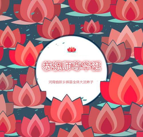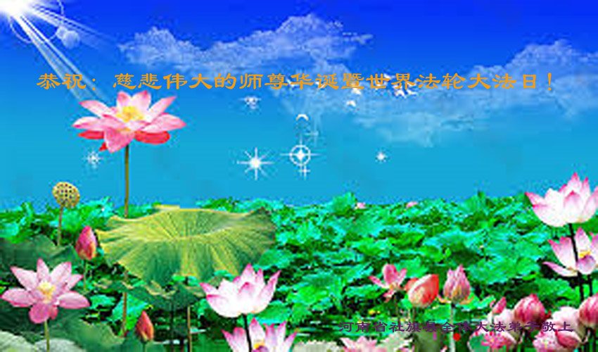 慈悲伟大的师父把宇宙特性真、善、忍传遍全球五洲四海,福泽于全世界人民。我们是正法时期的大法弟子,我们感到无比的骄傲和自豪,感到无比的幸福与荣耀。师尊把我们从地狱中捞起、洗净,救度我们成为令宇宙众生羡慕的生命“大法弟子”。师尊要求我们按真善忍做人;师尊为我们走在修炼的道路上操尽了心血;师尊为我们承担了很多苦难。师尊一步一步的保护着我们,指引着我们在神的道路上阔步前進,使我们在生活的艰难困苦中,有了从容和淡定,克服艰难险阻顶住了压力,勇往直前。我们能坦坦荡荡的走过来,向世间种下善的种子,放射善的永恒光芒,一切的一切都是师尊的慈悲救度。师父您辛苦了!弟子们叩拜师尊,恭祝师父生日快乐!我们要在师尊为弟子们延续来的有限时间里,多学法,学好法,炼好功,发正念,修好自己,多救人。提高自己的心性,像一株净莲出淤泥而不染,成为一个先他后我的修炼人。不辜负师父的期望,不负重托,不负誓约,助师正法,圆满随师回到我们真正的家园。 弟子们叩谢师尊! 河南一大法弟子恭祝慈悲伟大的师尊生日快乐!