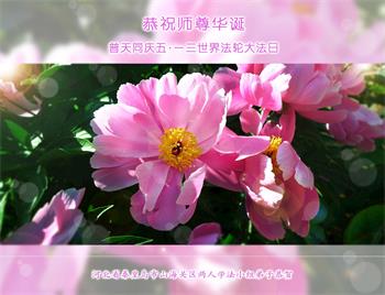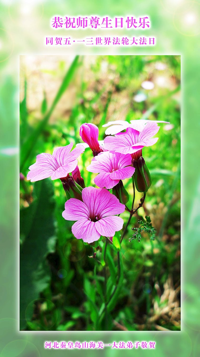 河北省秦皇岛市山海关区一大法弟子恭祝师尊生日快乐!同贺五·一三世界法轮大法日!弟子向师尊跪拜!多谢师尊慈悲救度! 弟子好好修,做好三件事,一定跟师尊回家。弟子在十年的修炼过程中,一路走来,看到师尊对弟子细心的安排和保护;出现矛盾时、遇到挫折时,得到您及时的点悟。开始修炼的前几年,是师尊牵着弟子的手一步步的走,现在师尊看护着弟子,让弟子自己往前走。过程中,弟子逐渐成熟起来,做到独立的在法中思考,走稳、走好每一步。师父:弟子一直在思考怎样做到慈悲、怎样做到善、做到忍,甚至连想都不想……弟子在默默的修自己、默默的做着自己该做的,真心希望在不久的将来达到您希望的那种生命境界。师恩浩荡!弟子跪谢师恩!在这普天同庆、法光普照的最美好的日子里,弟子向师尊献上一束小花——感悟到生命向上、迎接光明的力量;理解生命的生生不息又了然于心的容忍;那种不落凡尘的纯真。 河北省秦皇岛大法弟子七口之家恭祝师尊生日快乐!普天同庆世界法轮大法日!