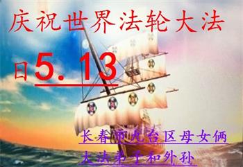吉林省长春市九台市区母女俩大法弟子和外孙庆祝世界法轮大法日!感恩师尊的慈悲救度!