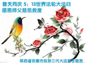 同庆第二十一届世界法轮大法日及大法洪传世界二十八周年! 陕西省安康市全体大法弟子恭祝慈悲伟大的师父生日快乐!