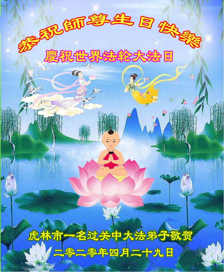 黑龙江省虎林市一名过关中大法弟子敬贺:恭祝师尊生日快乐!普天同庆世界法轮大法日!万般感激师父慈悲救度,唯有精進报师恩。 感恩 回首修炼路 悲喜语难诉 数劫生死关 险中师救度 洪恩何以报 信师心永固 助师多救人 了愿上高处 2020年4月29日 黑龙江省鸡西市虎林市东方红地区全体大法弟子恭祝师父生日快乐!