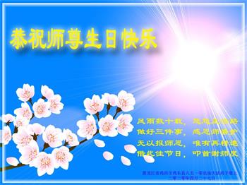 师尊您好!弟子恭祝您生日快乐!感谢您的慈悲救度!叩拜恩师救度之恩!弟子让您操心了,内心的感慨无以言表,只有向恩师说声对不起,弟子有决心做好,我能做好。只想看到恩师笑!谢谢恩师! 中国大陆黑龙江省鸡西市学法小组大法弟子恭祝慈悲伟大的师尊生日快乐!
