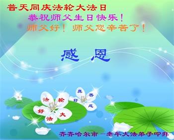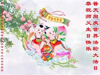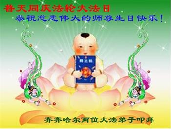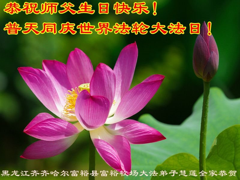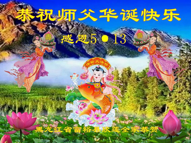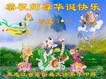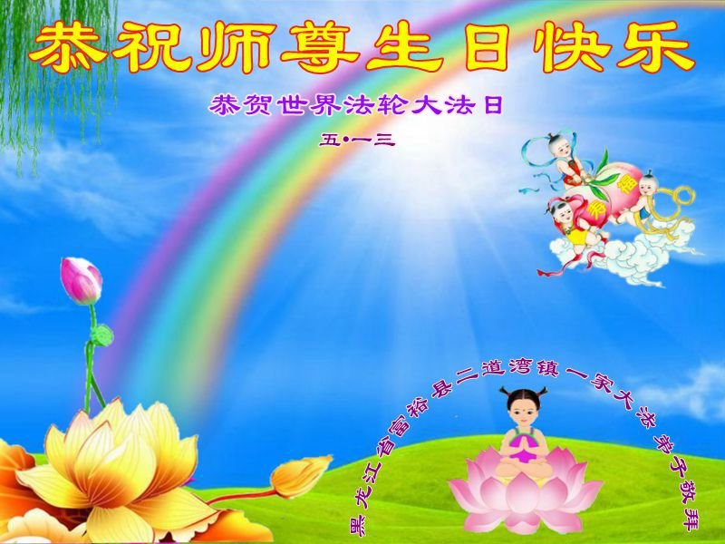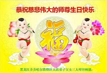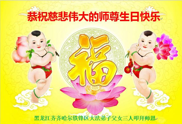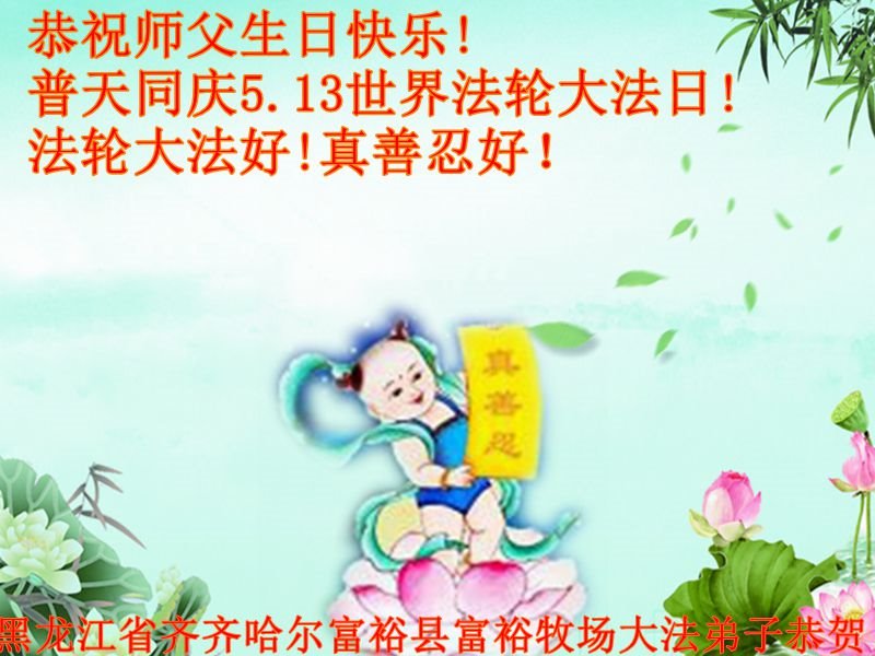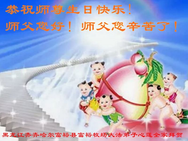 师父生日快乐!师父辛苦了!弟子一定精進,修好自己,多救人,做好三件事,跟师父回家。弟子叩拜师父! 黑龙江省齐齐哈尔市富裕一大法弟子恭贺世界法轮大法日!