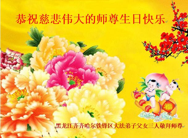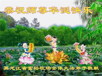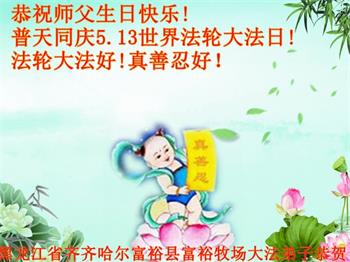 黑龙江省齐齐哈尔市富裕县富裕牧场一大法弟子全家恭祝师父生日快乐!普天同庆世界法轮大法日!