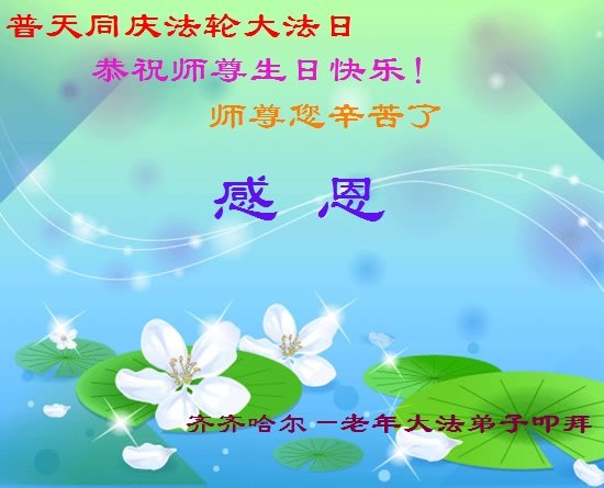 黑龙江省齐齐哈尔一老年大法弟子恭祝师父生日快乐!普天同庆世界法轮大法日!