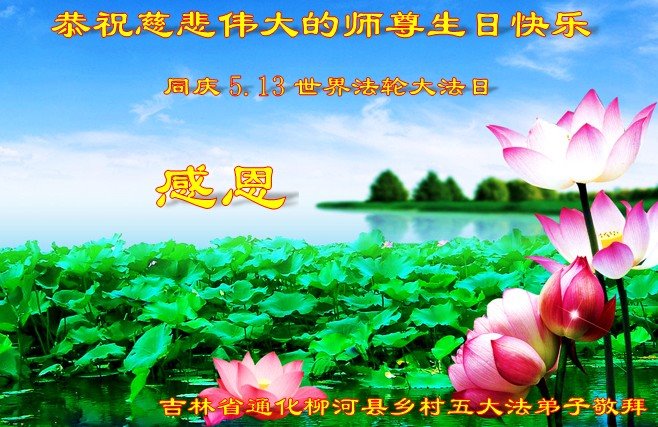 在这普天同庆的时刻,我们农村五大法弟子,感恩师父慈悲救度!师尊您辛苦了!叩谢师尊!合十! 吉林省通化柳河县农村三大法弟子恭祝慈悲伟大的师尊生日快乐!同庆世界法轮大法日!