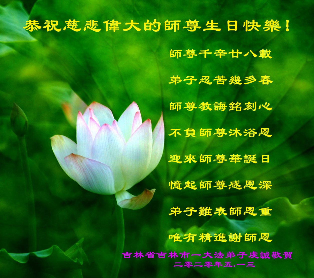 师尊千辛廿八载 弟子忍苦几多春 师尊教诲铭刻心 不负师尊沐浴恩 迎来师尊华诞日 忆起师尊感恩深 弟子难表师恩重 唯有精進谢师恩 吉林省吉林市一大法弟子虔诚敬贺 二零二零年五·一三 吉林省吉林市蛟河市全家大法弟子恭祝师尊生日快乐!