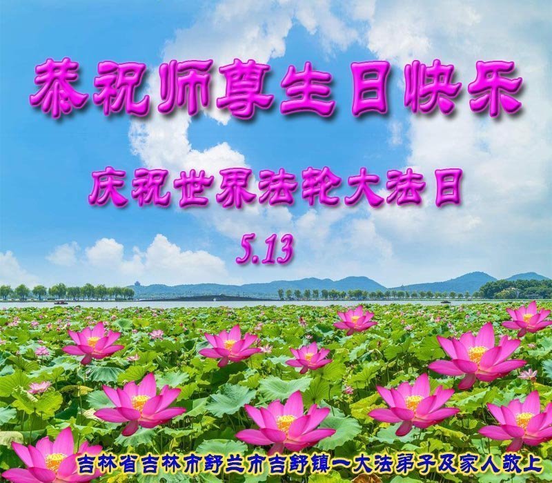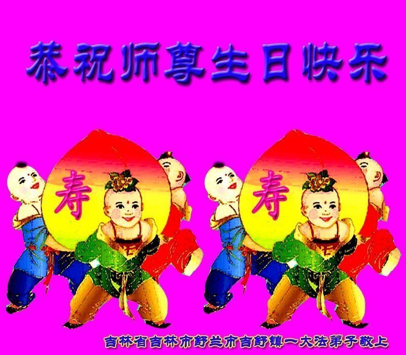 师尊您好:恭祝师尊生日快乐!感恩师尊对弟子们的慈悲保护!感恩师尊对众生的慈悲救度!感恩师尊挽救宇宙大穹!弟子叩拜师尊! 吉林省吉林市舒兰市吉舒镇大法弟子恭祝慈悲伟大的师尊生日快乐!庆祝法轮大法日!