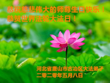 普天同庆世界法轮大法日! 师尊您好!师尊您辛苦了! 弟子真诚的感谢师尊对弟子、对家人和世人的慈悲保护与付出。不管修炼路还有多远,弟子一定努力做好三件事,精進、精進、再精進,跟师尊回家。 弟子跪拜师尊! 合十 唐山丰润区一大法弟子敬上 二零二零年四月二十九日 河北省唐山市古冶区大法弟子恭祝慈悲伟大的师尊生日快乐!恭贺世界法轮大法日!