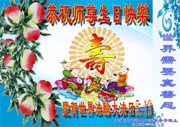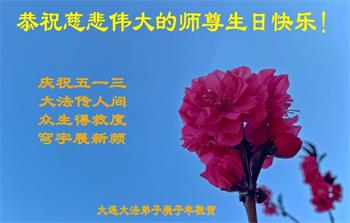在5.13世界法轮大法日即将来临之际,弟子以最真诚的心祝师尊生日快乐!弟子今后要努力做好三件事,多学法,多救众生,跟师尊回家。 辽宁省大连市普兰店市区一老年大法弟子恭祝师尊华诞暨世界法轮大法日!同庆法轮大法洪传世界二十八周年!