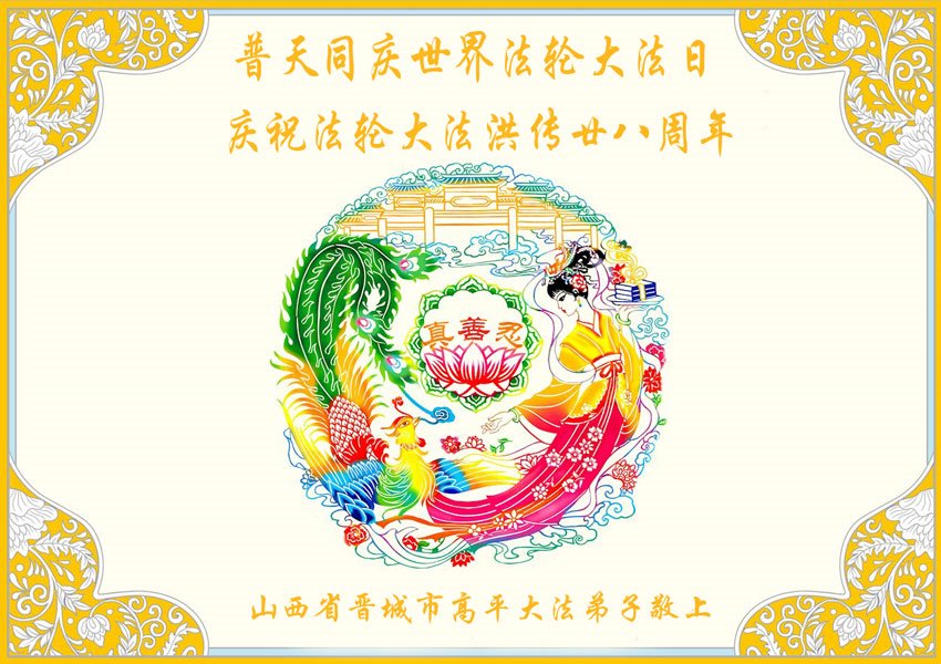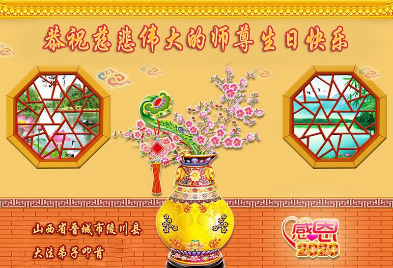 在世界法轮大法日来临之际,山西省晋城市大法弟子满怀崇敬的心情,向慈悲伟大的师尊致以崇高的敬意,叩首!师尊为我们的修炼,为众生的得度,付出了无数的心血,承受着无数的艰难和痛苦以及众生巨大的业力。这些都是弟子永远无法回报的。师尊啊,弟子一定要听您的话,认真做好三件事,更多的救度世人,圆满随师还! 七律·庆法轮大法日 作者 宇春 湛湛青天映水春,悠悠山黛散芳芬。 山川大地鸟鸣啼,玉宇琼楼万古存。 大法洪传度众生,佛光普照转金轮, 今逢圣日普天庆,再谢师尊救度恩。 山西省晋城市阳城县大法弟子恭祝师尊生日快乐!
