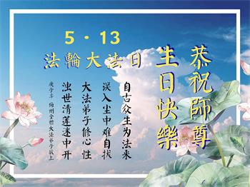 弟子定不负师尊的慈悲救度,精進实修,做好三件事,救度众生! 广东省大法弟子全家人恭祝师尊生日快乐!庆祝5·13世界法轮大法日!