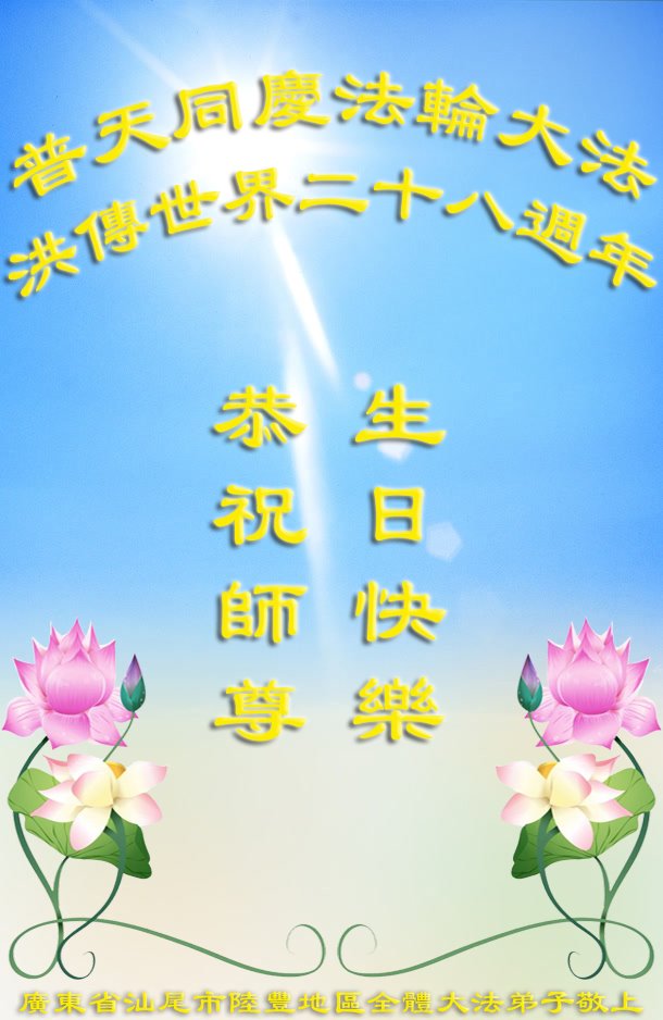 弟子想念师尊!弟子会按照师尊教诲,在修好自己的基础上,救度更多的众生。惟愿师尊笑! 广东省汕尾市陆丰地区全体大法弟子恭祝慈悲伟大的师尊生日快乐!