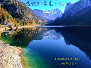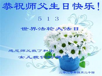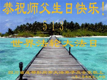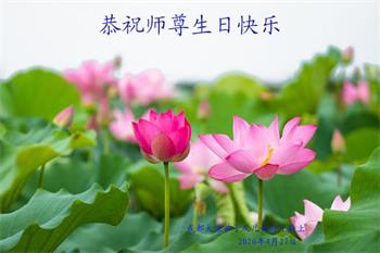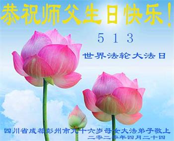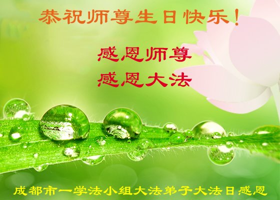 在世界法轮大法日这普天同庆的日子,祝师尊生日快乐! 弟子一定排除万难,尽一切努力多救人,兑现誓约,让师尊多一份欣慰。 四川省成都大法弟子合十敬上 四川省成都市温江大法弟子恭祝师尊生日快乐!
