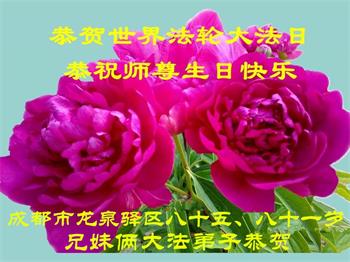 四川省成都市温江大法弟子及儿女孙子敬上 四川省成都市龙泉驿区八十五、八十一岁兄妹俩大法弟子恭贺世界法轮大法日!