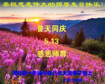 在5月13日世界法轮大法日来临之际,弟子感恩师尊救度之恩。学好法,向内找,做好三件事,紧跟正法進程,完成历史使命,跟师父回家! 邯郸一学法小组 河北省衡水市龙华镇一学法小组大法弟子恭祝师父生日快乐!
