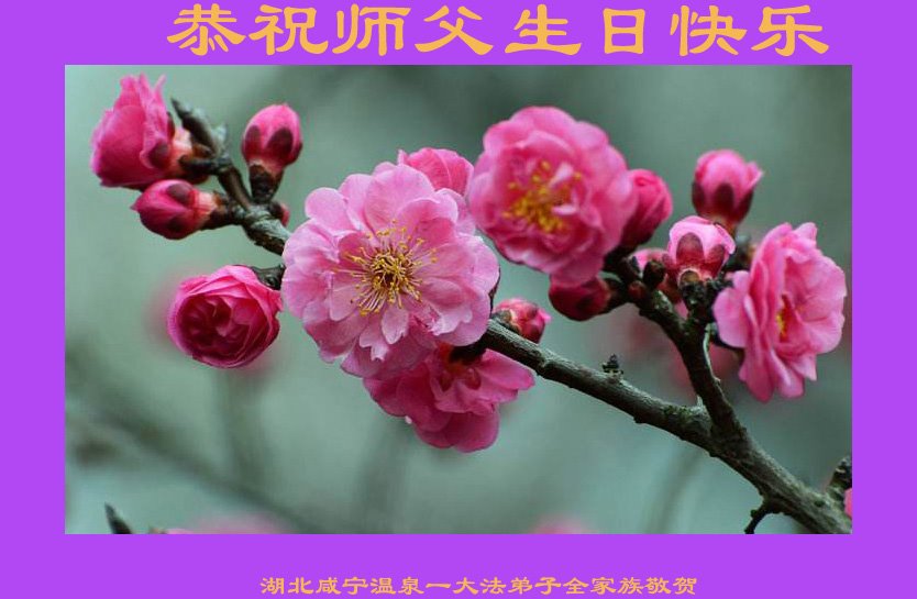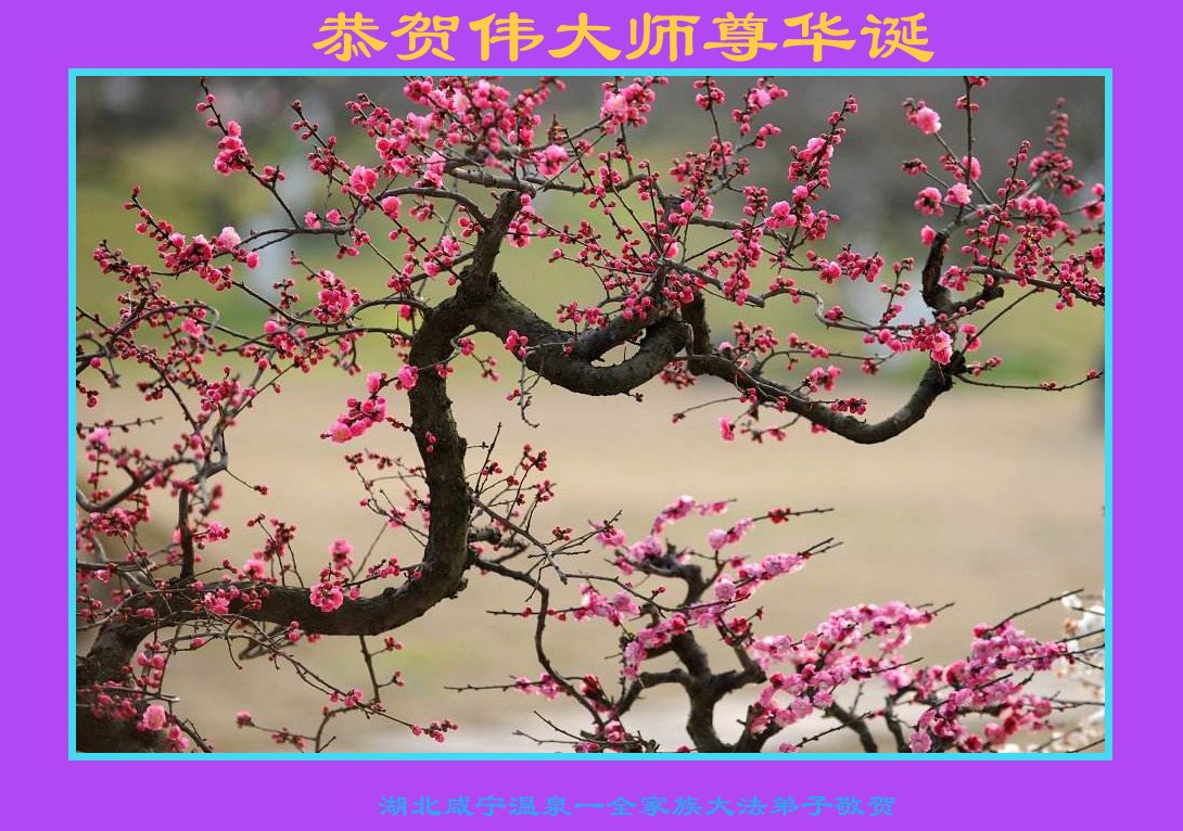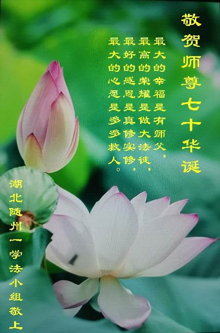 最大的幸福是有师父! 最大的荣耀是做大法徒, 最大的感恩是真修实修, 最大的心愿是多多救人。 湖北省随州市一学法小组大法弟子 湖北省咸宁市温泉一大法弟子全家族恭祝师父生日快乐!