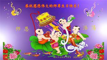 今年的武汉疫情导致全世界疫情严重,在生与死面前,人们更应该思考人生的意义何在?在利益与良知面前应该如何选择?弟子感恩师尊传给我们大法,使我们早就认识到了生命的真正意义在于回归传统、回归神指的路,从而返本归真,返回自己真正的家园。走过二十余年,今天的形势已经发生了翻天覆地的变化。真正有洞察力的人都已经知道大法的超常,明白大法真相的人越来越多。希望那些还被谎言蒙蔽、甚至曾经无知中参与过迫害的人,尽快改恶从善,找回自己的良知,这才是对自己生命最有利的选择。因为真正主宰这个世界的是神,而人的良知才是神最看重的。感恩师尊!敬祝师尊生日快乐! 湖北江汉平原大法弟子及家人恭祝师尊生日快乐!热烈庆祝世界法轮大法日!