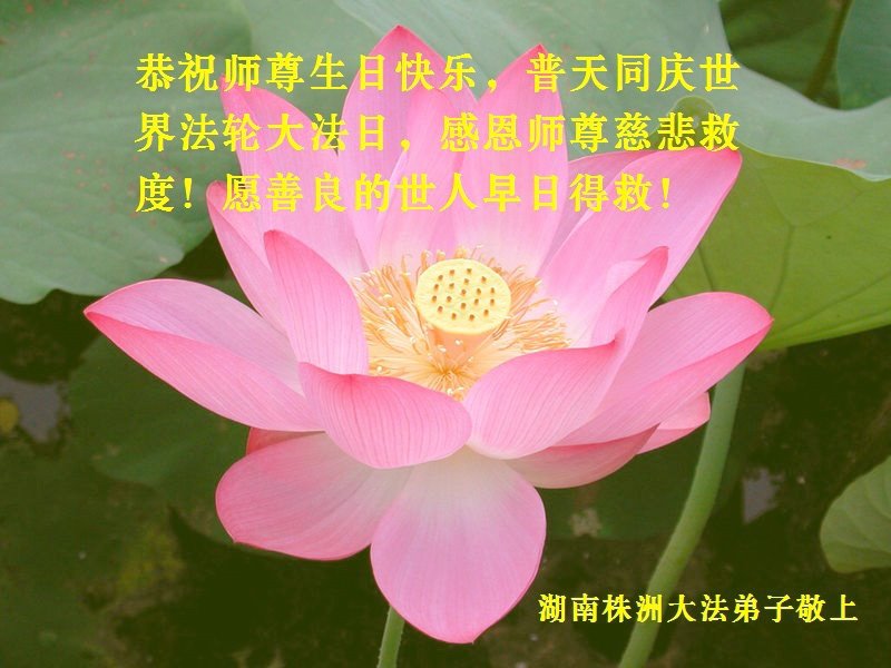 师尊您好!师尊您辛苦了!佛恩浩荡救众生,普天同庆世界法轮大法日!湖南湘潭全体大法弟子感恩师尊的救度!弟子们一定铭记使命,兑现誓约,不辜负师尊的期望和众生的期盼。在这普天同庆、同祝、同颂的喜庆日子里,我们全体大法弟子跪拜师尊!祝师尊生日快乐!弟子们非常想念师尊!弟子们有决心在正法的最后时刻,做的更好一些、救度更多的众生。 湖南省湘潭市全体大法弟子叩拜师尊!合十 湖南株洲大法弟子恭祝师父生日快乐!普天同庆世界法轮大法日!