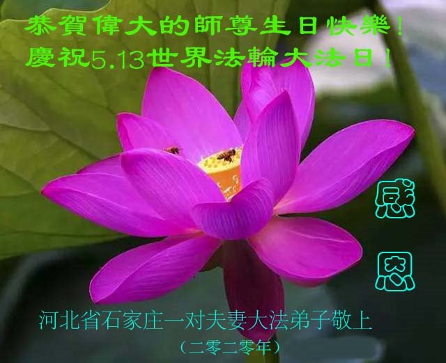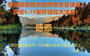 庆祝5.13世界法轮大法日! 我们一定形成整体,修好自己,精進再精進,做好讲真相救人的事,圆满完成历史大愿,不留遗憾,跟师尊回家! 二零二零年四月四日 河北省石家庄市一对夫妻大法弟子恭祝师尊生日快乐!庆祝世界法轮大法日!