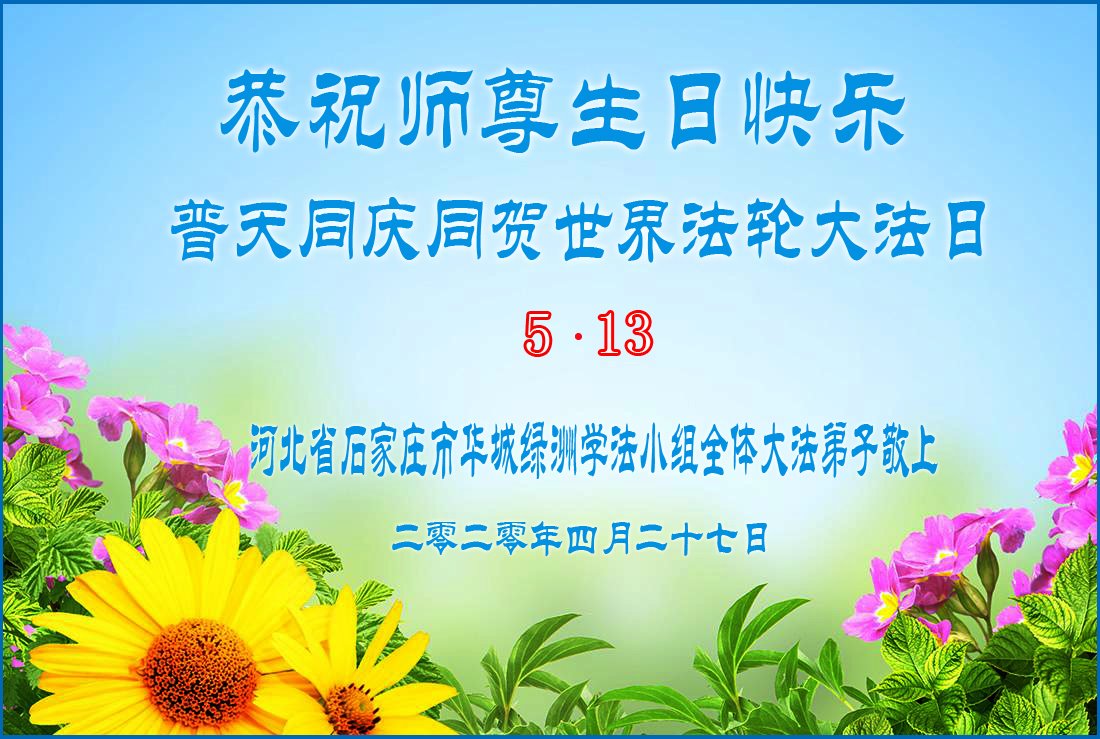 普天同庆同贺5·13世界法轮大法日! 河北省石家庄市华城绿洲学法小组全体大法弟子敬上 二零二零年四月二十七日 河北省石家庄市一学法小组全体大法弟子恭祝师尊生日快乐!