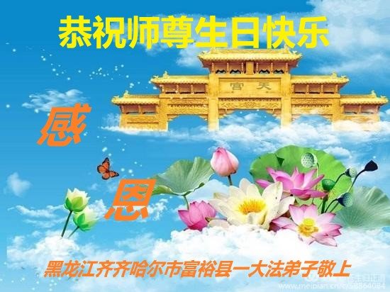 黑龙江齐齐哈尔市龙沙区大法弟子恭祝慈悲伟大的师尊生日快乐!恭贺法轮大法日!无限感恩慈悲伟大的师父救度之恩! 黑龙江省齐齐哈尔市富裕县一大法弟子恭祝师父生日快乐!