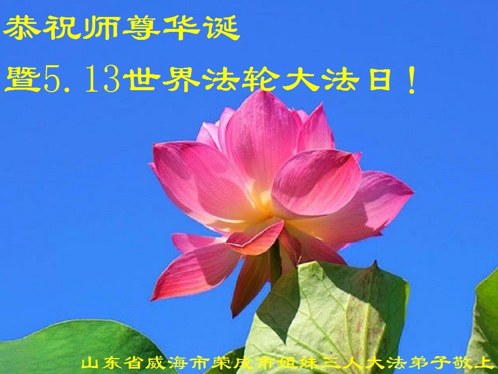 山东省威海市荣成市姐妹三人大法弟子恭祝师尊华诞暨5.13世界法轮大法日!