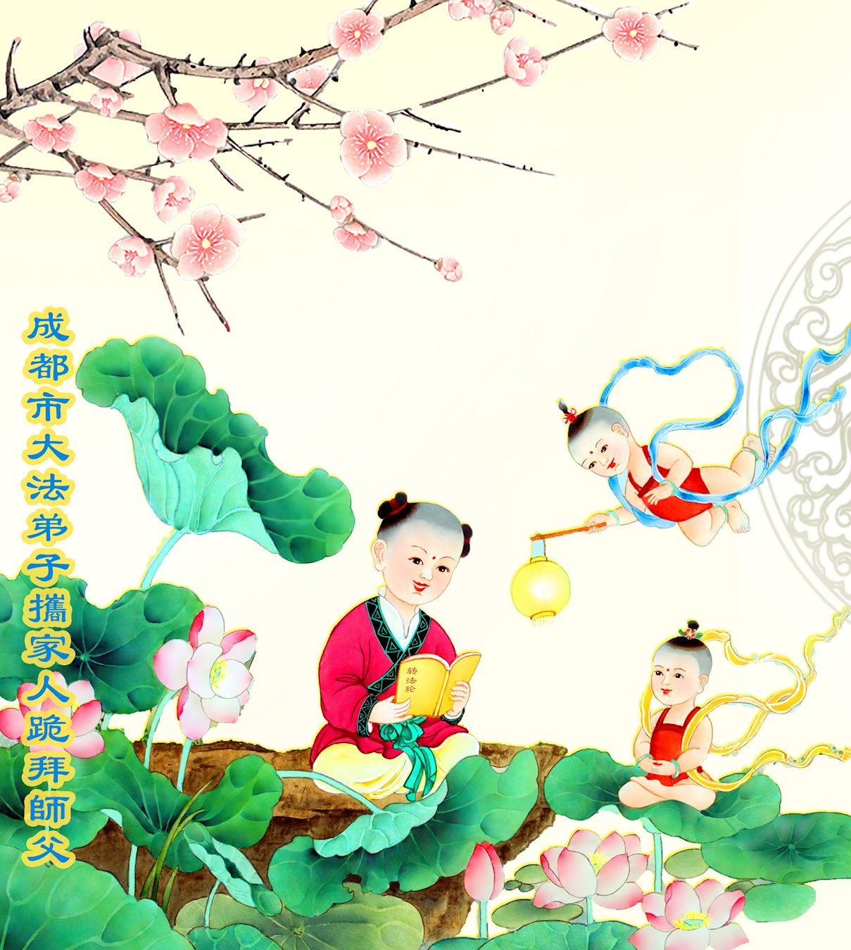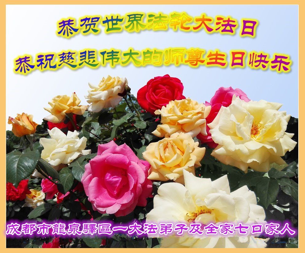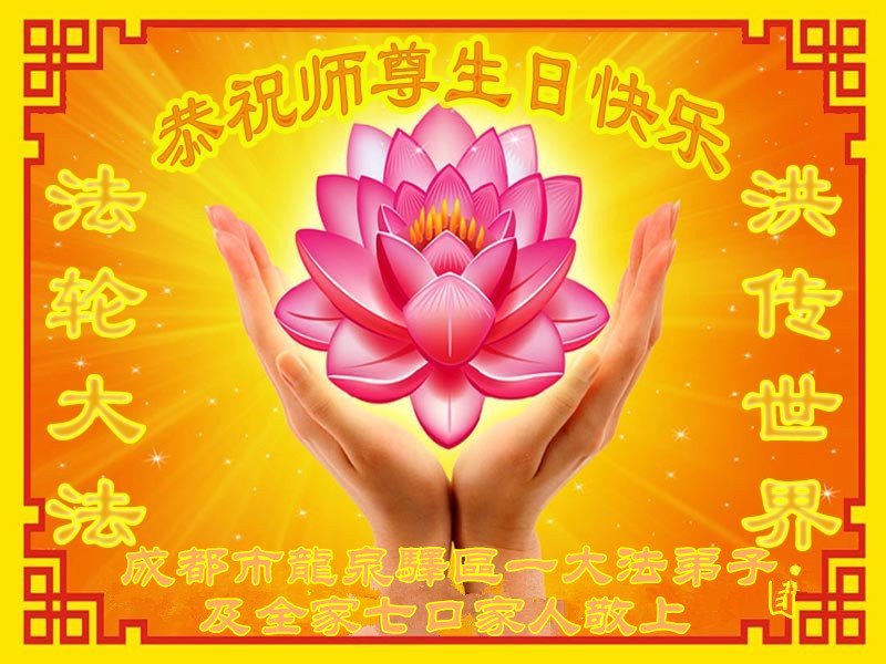 成都市龙泉驿区一大法弟子及全家七口家人恭贺世界法轮大法日! 恭祝慈悲伟大的师尊生日快乐! 四川成都一大法弟子的儿子恭祝师尊生日快乐!