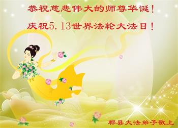 郫县大法弟子恭祝师尊生日快乐!普天同庆世界法轮大法日! 师尊您辛苦了!感谢师尊慈悲救度! 四川省成都市郫县大法弟子恭祝慈悲伟大的师尊师尊生日快乐!